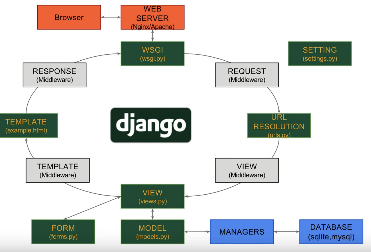 - 웹서버(Nginx)로부터 서버사이드 요청을 받으면 WSGI를 통해 장고로 전달하는 역할을 수행
