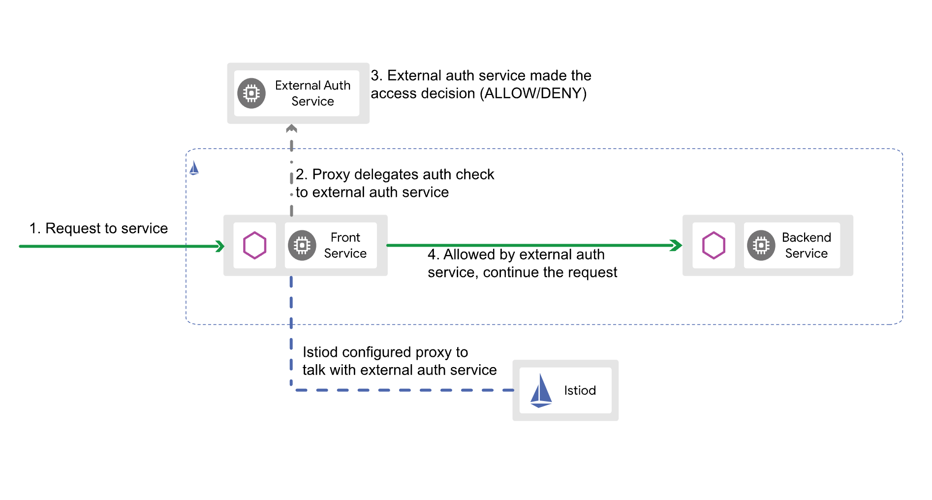 External Authorization은 Istio 데이터 플레인에서 트래픽을 처리하는 프록시인 Envoy Filter를 사용하여 구현됩니다. Envoy는 요청을 인증 서비스로 경유시키도록 하고 인증 서비스에 의해서 액세스 가능 여부를 결정하게 됩니다.